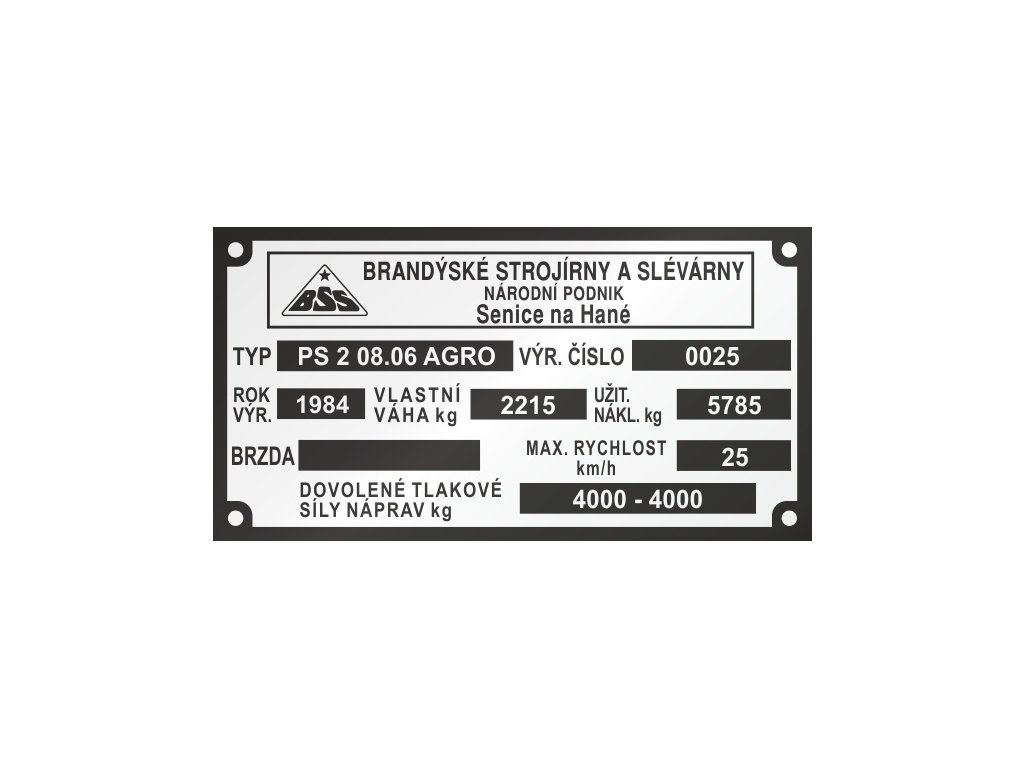 BSS PS2 Výrobný štítok, Brandýské strojírny a slévarny Senice nad Hané
