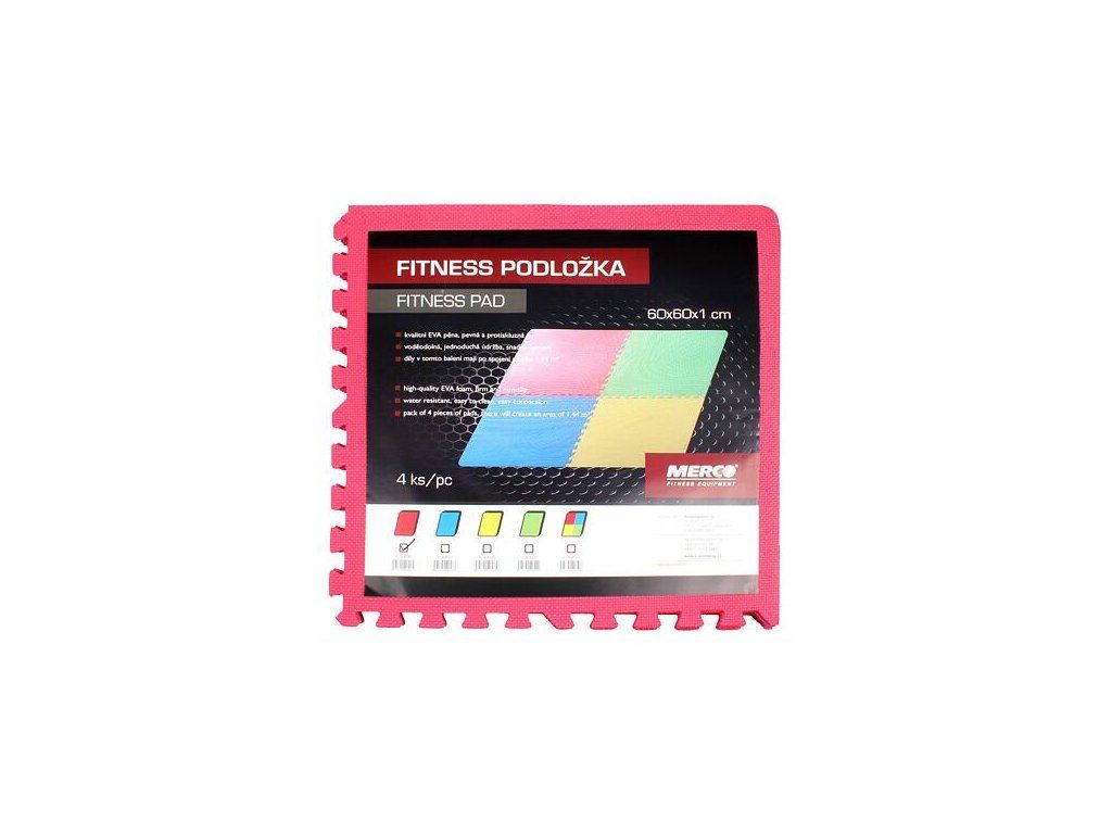 Fitness podložky Merco Colored Puzzle sú štyri dosky vyrobené z EVA peny. Podložky sú vhodné na cvičenie doma, v telocvični a vo fitness štúdiách. Použitý EVA materiál je pevný, vodeodolný a ľahko sa udržuje. Balenie fitness podložiek obsahuje štyri puzzle dosky 60 x 60 x 1 cm so zámkami na jednoduché spojenie. Ich spojením vznikne plocha 1,44 m2. Dokúpením ďalších balení môžete zväčšovať celkovú plochu podľa vašich potrieb. Pre úplnosť je každá doska doplnená ešte o dve hrany na zarovnanie celej plochy. Penové podložky nie sú vhodné pod ťažké fitness stroje. - sada 4 ks - rozmer 1 ks: 60 x 60 x 1 cm - celková plocha: 1,44 m2 - hmotnosť balenia: 1,12 kg - materiál: EVA pena - farba: červená, modrá, zelená, žltá : : :Dodatočné parametre