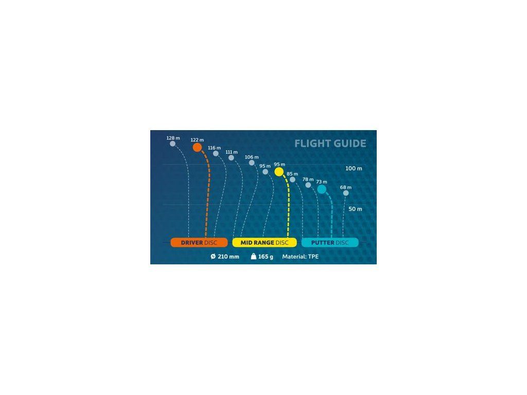 Disc Golf je šport, ktorý vznikol v 70. rokoch v USA a stáva sa čoraz viac populárny po celom svete. Tento outdoorový šport vychádza z klasického golfu. Účelom je dostať lietajúci disk do koša na čo najmenší počet hodov. V sade Disc Golf Set obdržíte 3 rôzne disky: Driver Disc pre dlhé vzdialenosti, Mid Range Disc pre stredné a krátke vzdialenosti a Putter Disc pre presné zakončenie do koša. Disky sú vyrobené z odolného TPE materiálu s priemerom 21 cm a hmotnosťou 171 - 174 g. Čísla parametrov jednotlivých diskov označujú Speed (rýchlosť) - Glide (schopnosť disku udržať sa vo vzduchu) - Turn (stabilita disku v 1.fázy letu) - Fade (stabilita disku v poslednej fáze letu). Pre kompletnú hru si kúpte aj kôš Disc Golf Target. Ak hľadáte zábavnú hru pre trávenie voľného času s rodinou či priateľmi, Disc Golf je rozhodne tou správnou voľbou.. Driver disc Disk pre dlhé vzdialenosti. Má veľmi nízky profil a počas letu má tendenciu sa stáčať, preto sa horšie kontroluje smer letu. Dlhý hod vyžaduje už určité skúsenosti. Výška: 13 mm Parametre: 8 - 4 - 2 - 2 Mid Range disc Tento disk je vhodný pre presnejšie hody približne na vzdialenosť 30 - 80 m. Disk lieta menšou rýchlosťou a vďaka vyššiemu profilu lepšie drží smer letu. Výška: 16 mm Parametre: 5 - 3 - 0 - 2 Putter disc Tento disk má vyšší profil, vďaka ktorému lieta rovno aj pri nízkej rýchlosti. Presný hod vyžaduje skúsenosti, začiatočníci musí mať trpezlivosť. Výška: 18 mm Parametre: 2 - 3 - 0 - 2 : :Dodatočné parametre