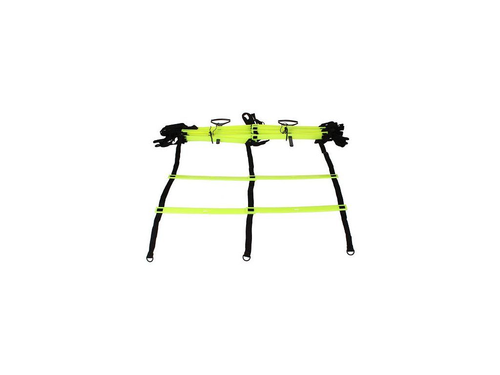 Dvojitý agility rebrík pre kondičnú prípravu športovcov. Plastové priečky rebríka sú ľahko nastaviteľné na prizpôsobenie vzdialenosti medzi jednotlivými priečkami podľa potrieb užívateľa. Unikátnym vylepšením sú madlá, ktoré je možné pretiahnuť stredom oboch rebríkov. Madlá potom slúžia nielen ako nosič, ale zabraňujú aj zamotaniu rebríkov. Agility rebrík 9m možno pomocou suchého zipsu rozdeliť na dva kusy 4,5m dlhé. Rebrík je široký 80 cm. Upozornenie: Agility rebríky neslúžia v žiadnom prípads na lezenie, ale k cvičeniu techniky a rýchlosti športovcov na zemi. : :Dodatočné parametre