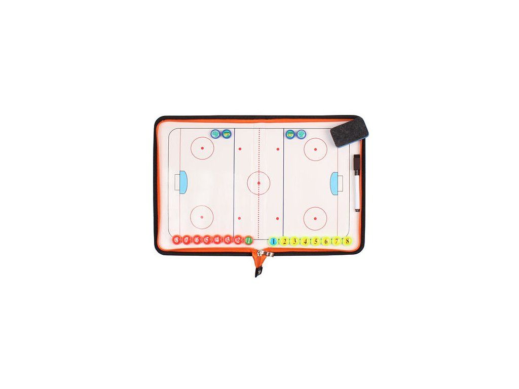Trénerská tabuľa Hockey RX46 patrí medzi vybavenie trénerov súťažných hokejových klubov na demonštrovanie a plánovanie herného postupu. Tvrdé magnetické dosky na zips sú zhotovené zo syntetickej PU kože s celkovou hmotnosťou približne 450 gramov. Magnetická trénerská tabuľa Hockey RX46 po rozložení znázorňuje celé hokejové ihrisko na oboch svojich stranách. Pre rozmiestnenie hráčov v poli využijete dve sady magnetov s číslami (8 neonovo žltých, 8 neónovo oranžových a 4 modré). Pre znázornenie ďalších strategických pokynov poslúži čierny popisovač s hubkou. Rozmery zatvorenej tabule sú 28 x 20 cm. : : :Dodatočné parametre
