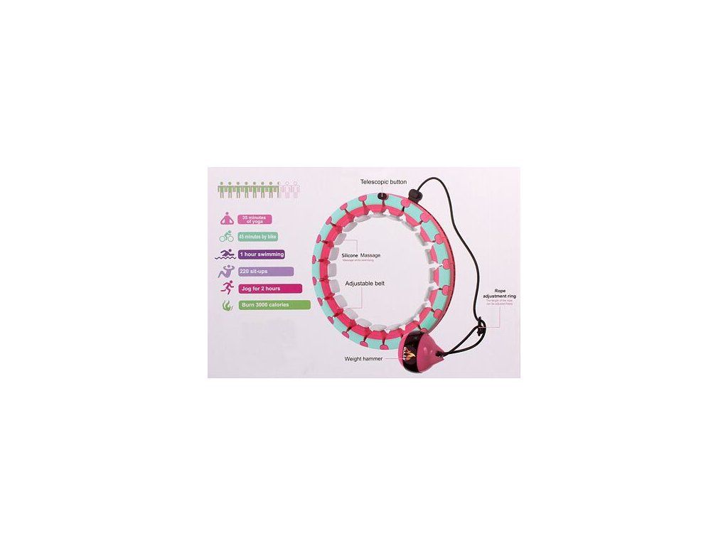 Pri krúžení panvou s obručou dochádza k rýchlemu odbúravaniu prebytočného tuku v oblasti pása a brucha a k efektívnemu spaľovaniu kalórií. S obručou Hula Hoop Smart je toto cvičenie ešte účinnejšie a zábavnejšie a zvládne ho aj úplný začiatočník. Táto obruč, na rozdiel od klasických obručí obručí, neskĺzava a vďaka nastaviteľnosti sa prispôsobí každej postave. Je vyrobená z pevného plastu ABS a funguje na princípe závažia, ktoré je povrázkom pripevnené k jazdcovi vo vnútri konštrukcie obruče a ktoré krúživým pohybom panvou uvediete do pohybu okolo tela. Obruč sa skladá z 24 samostatných odnímateľných článkov s pomocou ktorých je nastavenie požadovaného obvodu pása otázkou pár sekúnd. Maximálny obvod pása je možné nastaviť až na 110 cm. Nastaviteľná je aj dĺžka povrázku závažia a to na 22 - 40 cm. V prípade potreby je možné rozobrať závažie povolením skrutky na spodnej časti a odobratím záťaže znížiť jej celkovú váhu. Vnútorná časť obruče je tvorená pružnými masážnymi silikónovými výstupkami, ktoré pri otáčaní závažia telo masírujú a zároveň fungujú aj ako tlmiče tlaku. Pre čo najvyšší efekt cviku odporúčame vykonávať krúženie so závažím aspoň 30 minút. Skvelá a univerzálna fitness pomôcka Hula Hoop Smart je vhodná pre celú rodinu. Obruč Hula Hoop Smart ponúkame v 5 farebných prevedeniach (fialová, modrá, ružová, šedá, zelená). Pred zahájením cvičenia s obručou si starostlivo prečítajte návod na použitie a bezpečnostné inštrukcie. Parametre: - maximálny vonkajší priemer obruče: 45 cm - maximálny vnútorný priemer obruče: 35 cm - maximálny obvod pása: 110 cm - počet odnímateľných článkov: 24 - váha obruče pri maximálnom rozmere bez závažia: 0,9 kg Jednotlivý článok obruče: - rozmer : š x v x hl.: 6 x 5 x 5 cm - váha 1 článku: 0,04 kg Závažie obruče: - váha závažia: 0,37 kg - rozmer: š x v x hl. : 8,5 x 9 x 8 cm - dĺžka povrázku závažia min/max: 22 – 40 cm Materiál: ABS a POM plast, silikón : : :Dodatočné parametre
