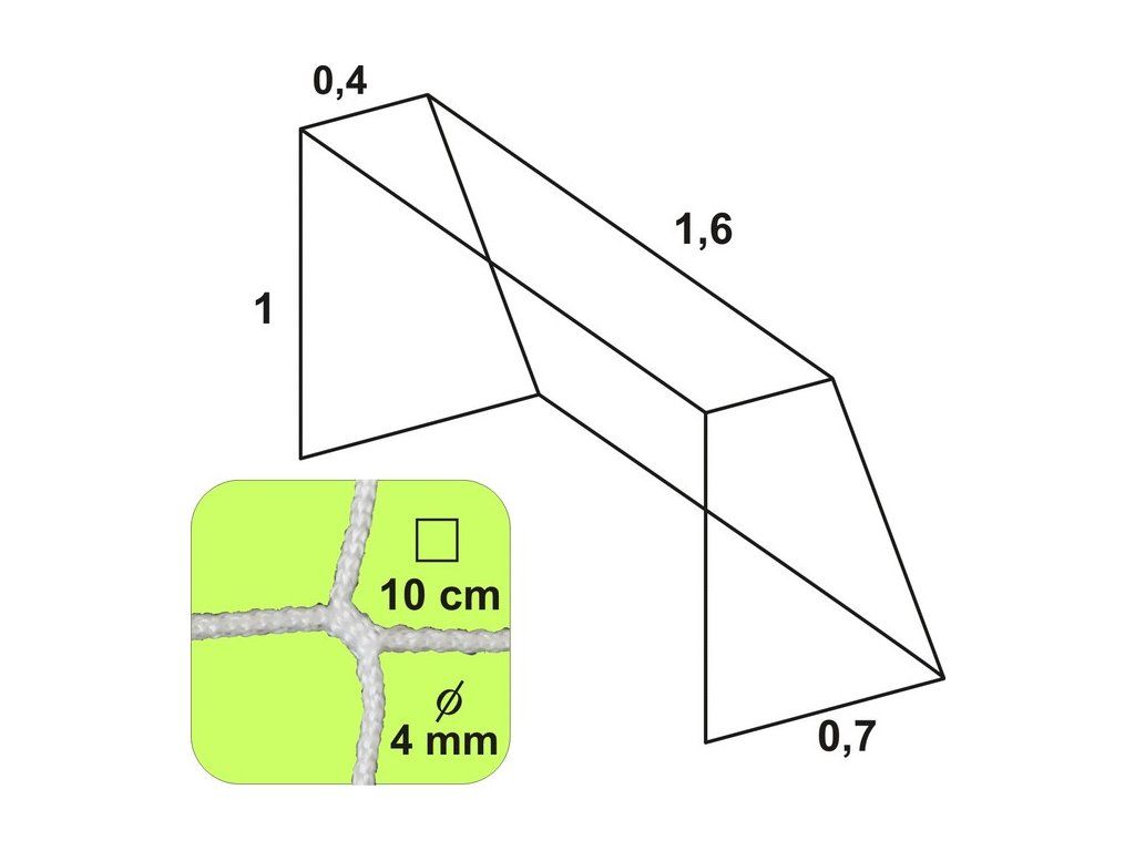 Rozmery siete: Šírka: 1,6 m Výška: 1 m Horná hĺbka: 0,4 m Spodná hĺbka: 0,7 m Veľkosť oka: 10 cm Hrúbka siete: 4 mm Farba. biela balenie po 1ksDodatočné parametre