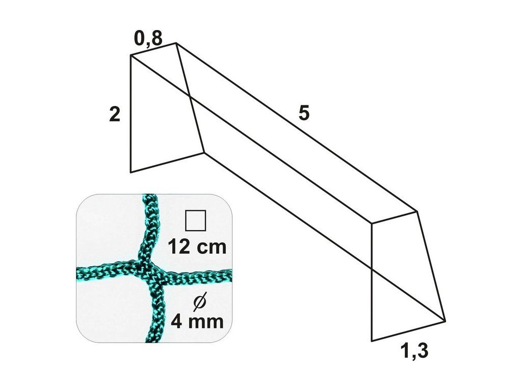 Sieť na futbalovú bránku - bezuzlová Rozmery: Šírka siete: 5 m Výška siete: 2 m Hĺbka siete hore: 0,8 m Hĺbka siete dole: 1,3 m Hrúbka siete: 4 mm Veľkosť oka: 12 cm Použitý materiál: UV stabilizovaný polypropylén Farba zelená. Farebné možnosti sietí vyrobených na zákazku: zelená Balenie 1 ksDodatočné parametre