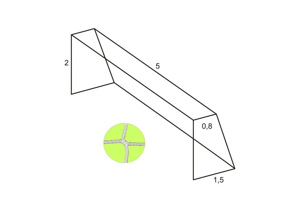 Sieť na futbalovú bránku - bezuzlová Rozmery: Šírka siete: 5m Výška siete: 2 m Hĺbka siete hore: 0,8 m Hĺbka siete dole: 1,5 m Hrúbka siete: 4 mm Veľkosť oka: 12 cm Použitý materiál: UV stabilizovaný polypropylén Farba biela. Farebné možnosti sietí vyrobených na zákazku: zelená Balenie 1 ksDodatočné parametre