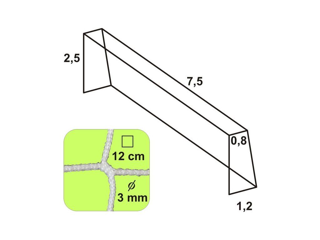 Sieť na futbalovú bránku – bezuzlová Rozmery: Šírka siete: 7,5m Výška siete: 2,5 m Hĺbka siete hore: 0,8 m Hĺbka siete dole: 1,2 m Hrúbka siete: 3 mm Veľkosť oka: 12 cm Použitý materiál: UV stabilizovaný polypropylén Farba biela. Farebné možnosti sietí vyrobených na zákazku: zelená Balenie 1 ksDodatočné parametre