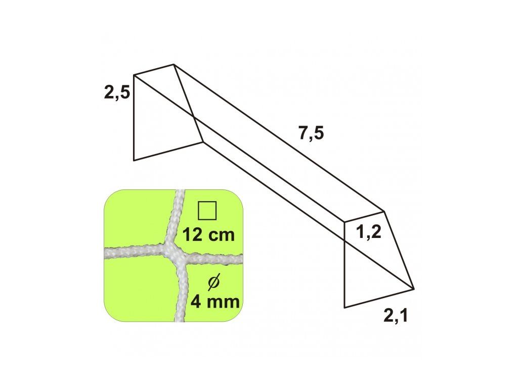 Sieť na futbalovú bránku – bezuzlová Rozmery: Šírka siete: 7,5m Výška siete: 2,5 m Hĺbka siete hore: 1,2 m Hĺbka siete dole: 2,1 m Hrúbka siete: 4 mm Veľkosť oka: 12 cm Použitý materiál: UV stabilizovaný polypropylén Farba biela. Farebné možnosti sietí vyrobených na zákazku: zelená Balenie 1 ksDodatočné parametre