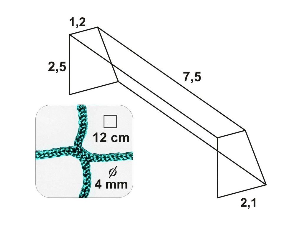 Popis produktu: Sieť na futbalovú bránku - bezuzlová Rozmery: Šírka siete: 7,5m Výška siete: 2,5 m Hĺbka siete hore: 1,2 m Hĺbka siete dole: 2,1 m Hrúbka siete: 4 mm Veľkosť oka: 12 cm Použitý materiál: UV stabilizovaný polypropylén Farba biela. Farebné možnosti sietí vyrobených na zákazku: zelená Balenie 1 ksDodatočné parametre