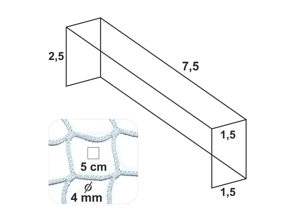 Sieť na futbalovú bránku – bezuzlová háčkovaná Rozmery: Šírka siete: 7,5m Výška siete: 2,5 m Hĺbka siete hore: 1,5 m Hĺbka siete dole: 1,5 m Hrúbka siete: 4 mm Veľkosť oka: 5 cm Použitý materiál: UV stabilizovaný polypropylén Farba biela. Farebné možnosti sietí vyrobených na zákazku: zelená Balenie 1 ksBuďte prvý, kto napíše príspevok k tejto položke.