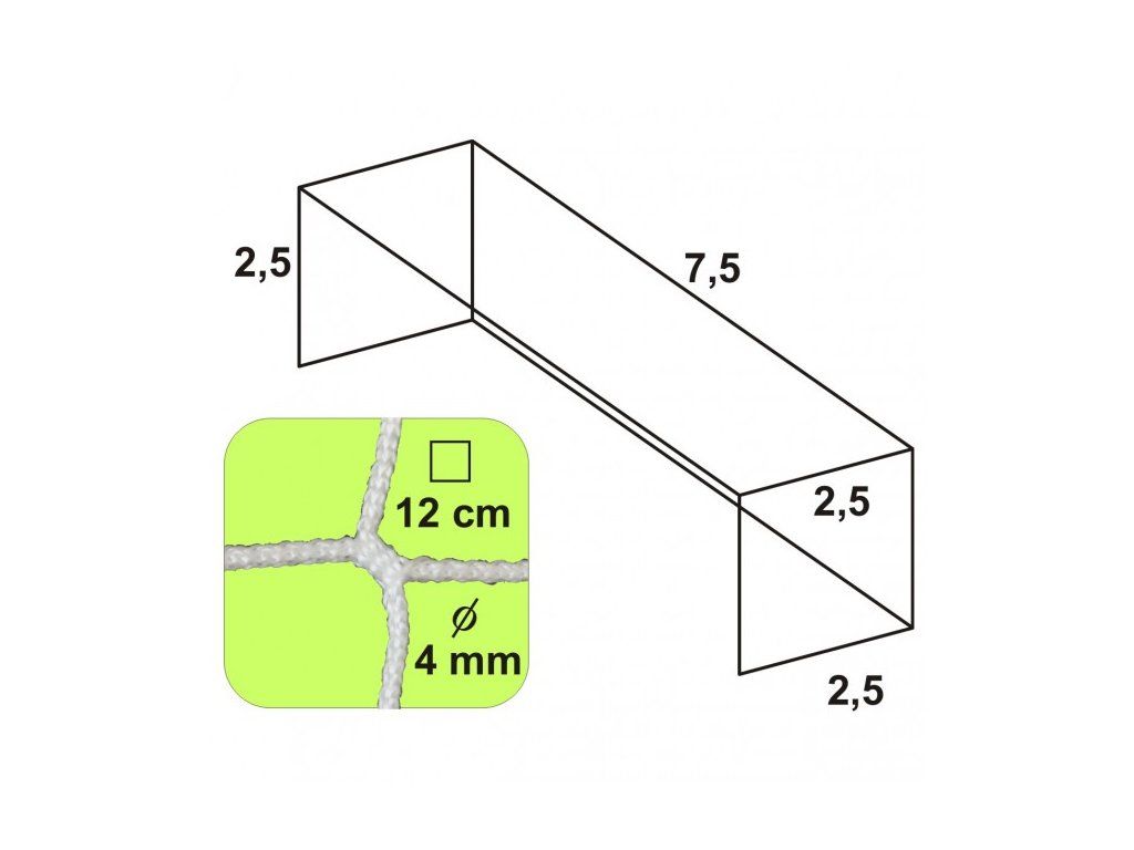 Sieť na futbalovú bránku – bezuzlová Rozmery: Šírka siete: 7,5m Výška siete: 2,5 m Hĺbka siete hore: 2,5 m Hĺbka siete dole: 2,5 m Hrúbka siete: 4 mm Veľkosť oka: 12 cm Použitý materiál: UV stabilizovaný polypropylén Farba biela. Farebné možnosti sietí vyrobených na zákazku: zelená. Balenie 1 ksDodatočné parametre