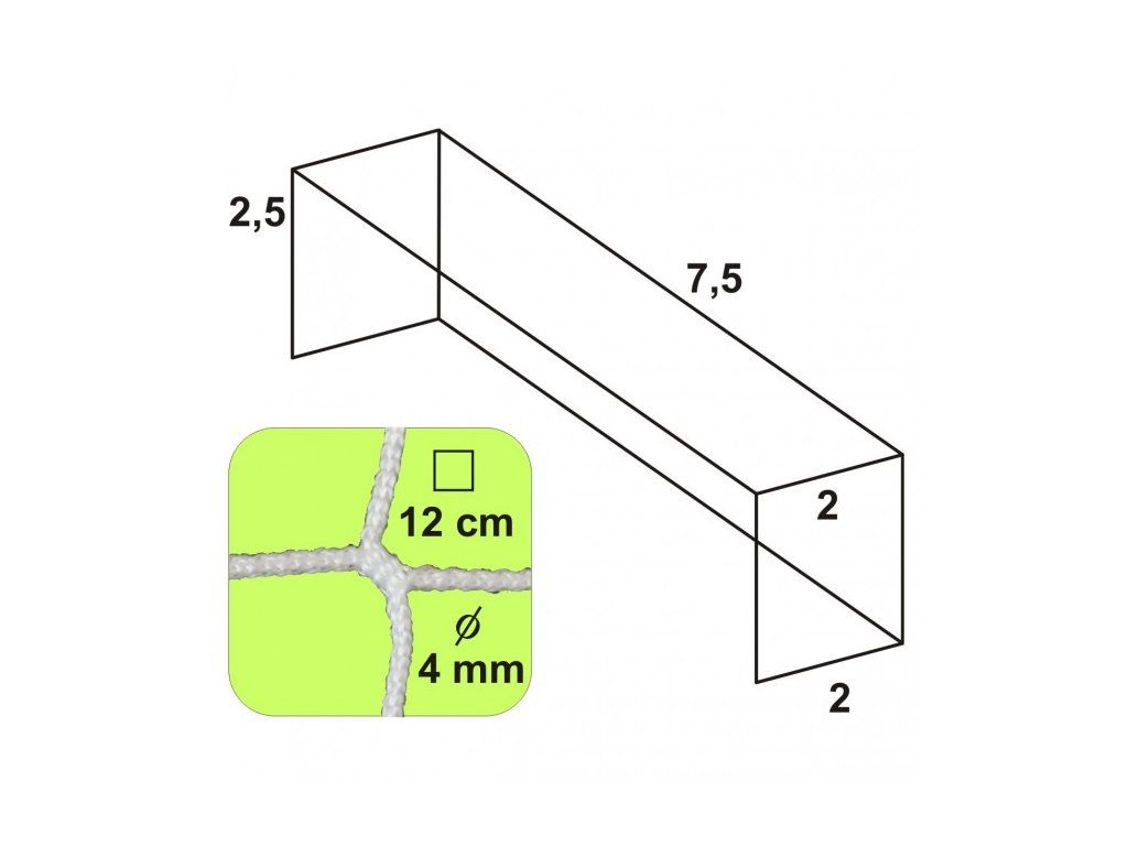 Sieť na futbalovú bránku – bezuzlová Rozmery: Šírka siete: 7,5m Výška siete: 2,5 m Hĺbka siete hore: 2 m Hĺbka siete dole: 2 m Hrúbka siete: 4 mm Veľkosť oka: 12 cm Použitý materiál: UV stabilizovaný polypropylén Farba biela. Farebné možnosti sietí vyrobených na zákazku: zelená. Balenie 1 ksDodatočné parametre