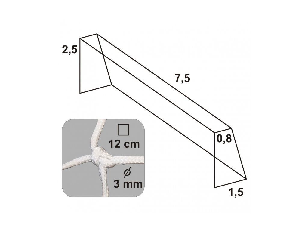Sieť na futbalovú bránku – uzlová Rozmery: Šírka siete: 7,5m Výška siete: 2,5 m Hĺbka siete hore: 0,8 m Hĺbka siete dole: 1,5 m Hrúbka siete: 3 mm Veľkosť oka: 12 cm Použitý materiál: UV stabilizovaný polypropylén Farba biela. Farebné možnosti sietí vyrobených na zákazku: zelená, modro-biela, zeleno-biela, červeno-biela. Šírka farebných pruhov je 60 cm. Balenie 1 ksDodatočné parametre