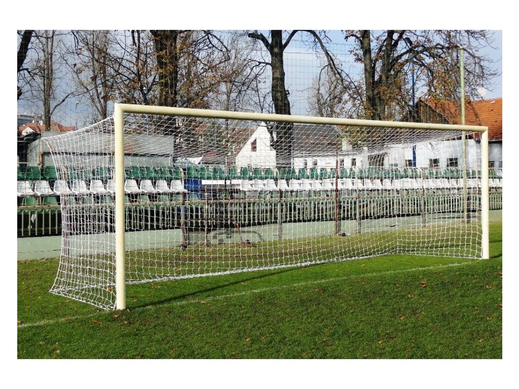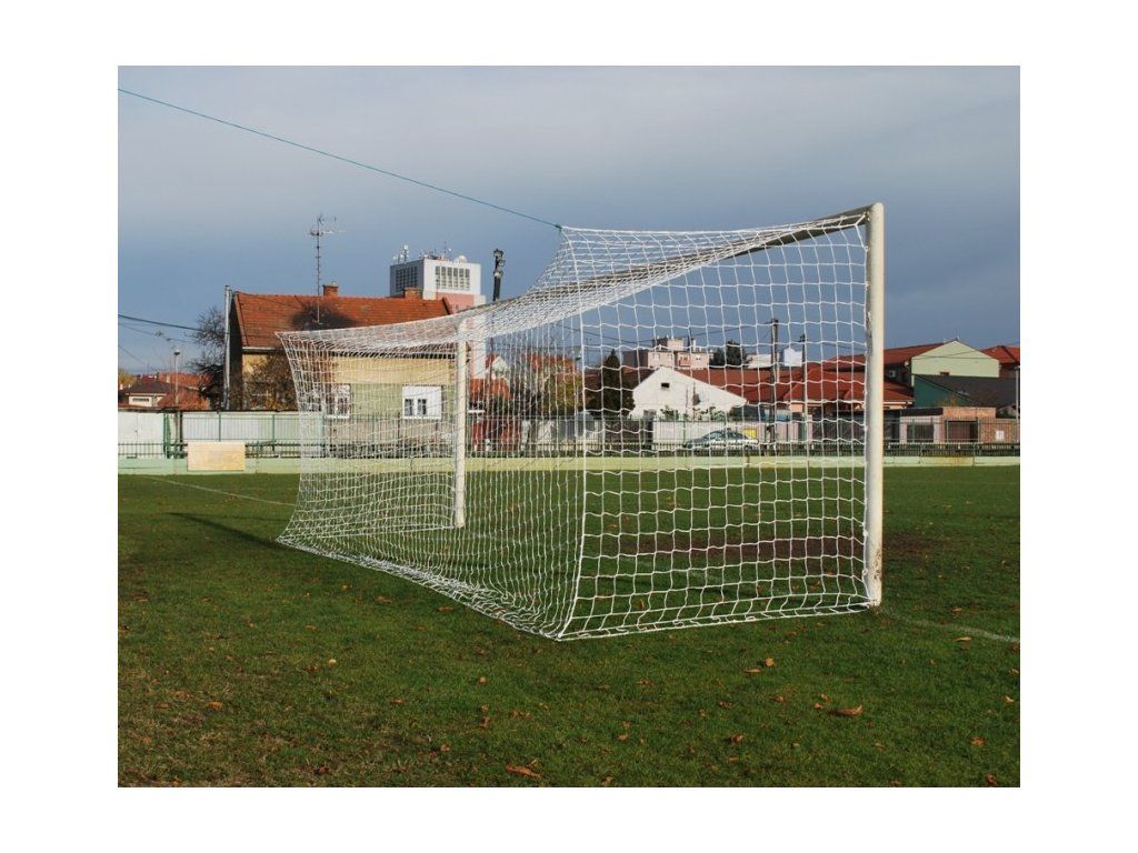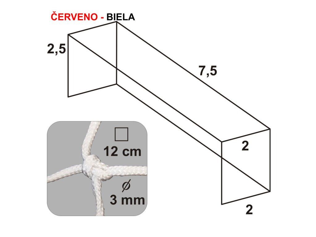 Sieť na futbalovú bránku – uzlová Rozmery: Šírka siete: 7,5m Výška siete: 2,5 m Hĺbka siete hore: 2 m Hĺbka siete dole: 2 m Hrúbka siete: 3 mm Veľkosť oka: 12 cm Použitý materiál: UV stabilizovaný polypropylén Farba bielo červená, pásy sa strierajú po 60 cm Farebné možnosti sietí vyrobených na zákazku: zelená Balenie 1 ksDodatočné parametre