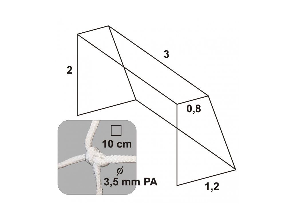 Sieť na hádzanársku bránku uzlová Rozmery: Šírka siete: 3 m Výška siete: 2 m Hĺbka siete hore: 0,8 m Hĺbka siete dole: 1,2 m Hrúbka siete: 3,5 mm Veľkosť oka: 10 cm Použitý materiál: UV stabilizovaný polyamid. Farba biela. Balenie 1 ksDodatočné parametre