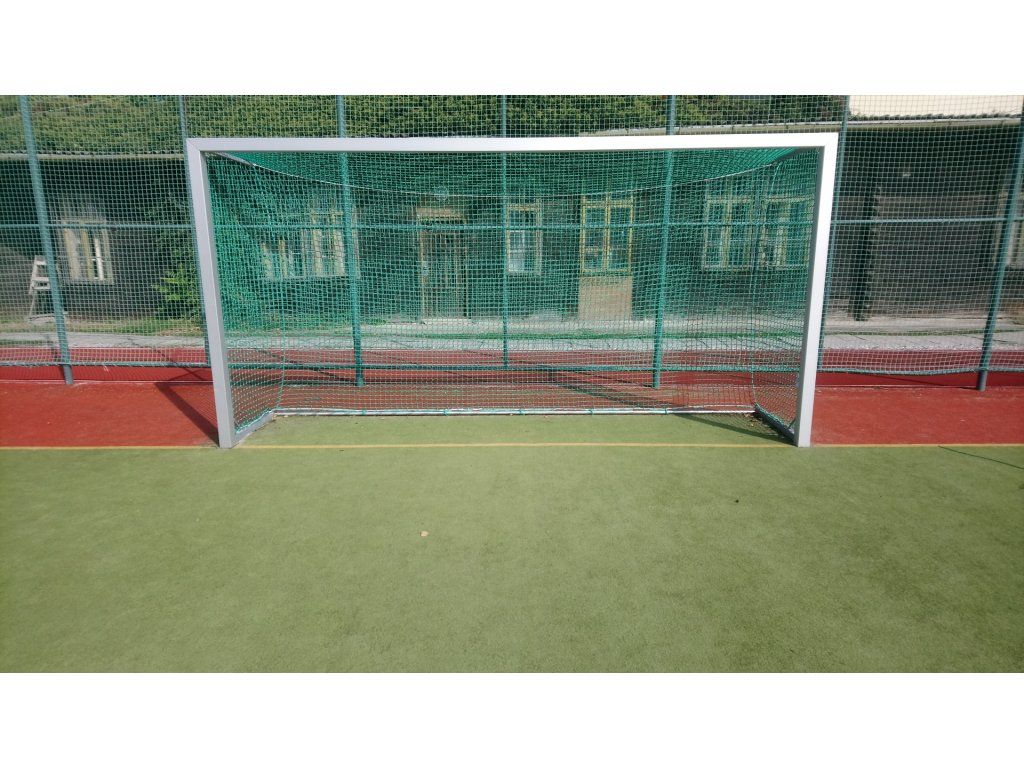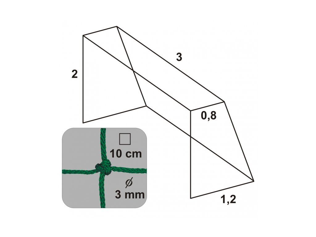 Sieť na hádzanársku bránku uzlová Rozmery: Šírka siete: 3 m Výška siete: 2 m Hĺbka siete hore: 0,8 m Hĺbka siete dole: 1,2 m Hrúbka siete: 3 mm Veľkosť oka: 10 cm Použitý materiál: UV stabilizovaný polypropylén Farba zelená Balenie 1 ksDodatočné parametre