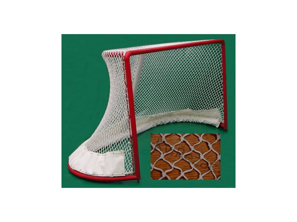 Sieť na hokejovú bránku uzlová strojová Rozmery: Šírka siete: 1,88 m Výška siete: 1,24 m Dĺžka horného oblúka: 2,58 m Dĺžka spodného oblúka: 4,18 m Hrúbka siete: 3 mm PP Veľkosť oka: 3,5 cm Použitý materiál: UV stabilizovaný polypropylén Farba biela.Dodatočné parametre
