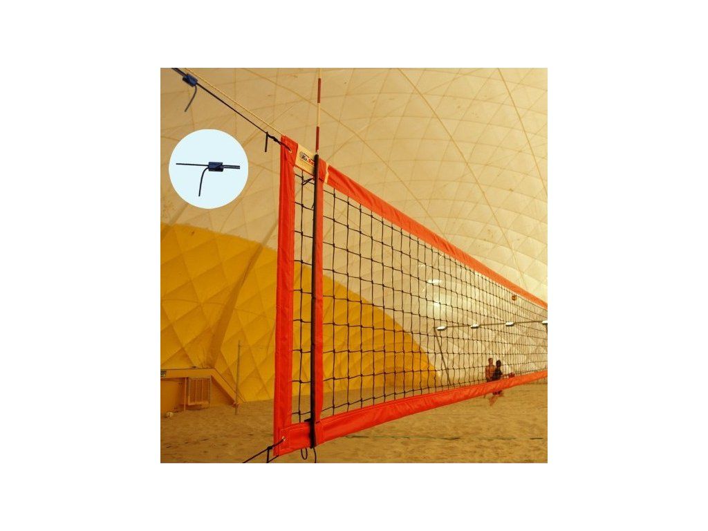 Sieť na plážový volejbal so 4 rýchlonapinákmi Sieť na súťažný plážový volejbal je vyrobená podľa medzinárodných noriem. Beach volejbalová sieť je vyrobená z uzlovej sieťoviny z 3 mm polypropylénovej šnúry s 10 cm okami. Horné a spodné okraje sú lemované pogumovanou látkou bielej, modrej, oranžovej alebo žltej farbe, o šírke 8 cm. Na bokoch je čierna PES páska vystužená laminátovou tyčkou. V hornej páske je pretiahnuté kevlarové lanko dĺžke 12,5 m. Na obidvoch stranách siete sú 2 úväzky s rýchlonapinákmi. Antenky a puzdro na antenky nie sú súčasťou siete. Rozmery siete: Šírka 8,5 m Výška 1 m Oko: 10 cm Materiál: 3 mm uzlová UV stabilizovaná polypropylénová sieť čiernej farby. Lemovanie siete: červenéDodatočné parametre