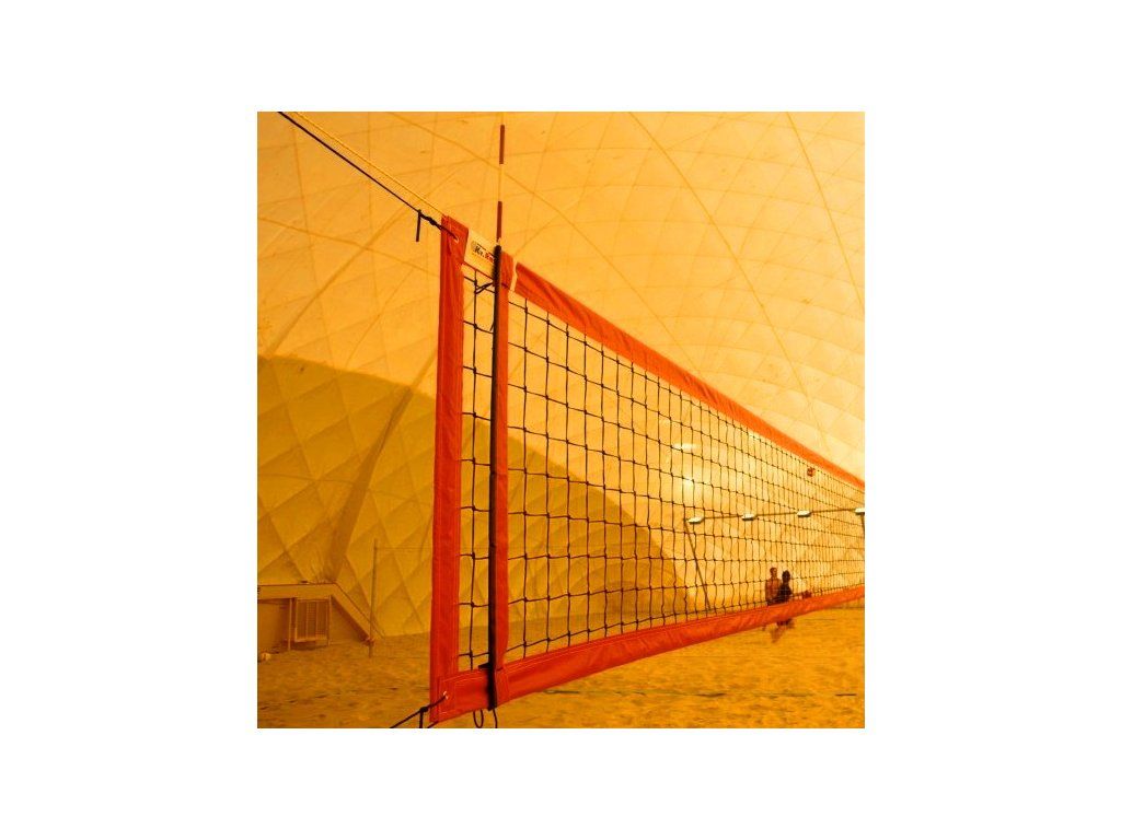 Sieť na plážový volejbal s 4 úväzkami Sieť na súťažný plážový volejbal je vyrobená podľa medzinárodných noriem. Beach volejbalová sieť je vyrobená z uzlovej sieťoviny z 3 mm polypropylénovej šnúry, s 10 cm okami. Horné a spodné okraje sú lemované pogumovanou látkou bielej, modrej, oranžovej alebo žltej farby, o šírke 8 cm. Na bokoch je čierna PES páska vystužená laminátovou tyčkou. V hornej páske je pretiahnuté kevlarové lanko V dĺžke 12,5 m. Na obidvoch stranách sieti sú 2 úväzky. Antenky a puzdro na antenky nie sú súčasťou siete. Rozmery siete: Šírka 8,5 m Výška 1 m Oko: 10 cm Materiál: 3 mm uzlová UV stabilizovaná polypropylénová sieť čiernej farby. Lemovanie siete: červenéDodatočné parametre