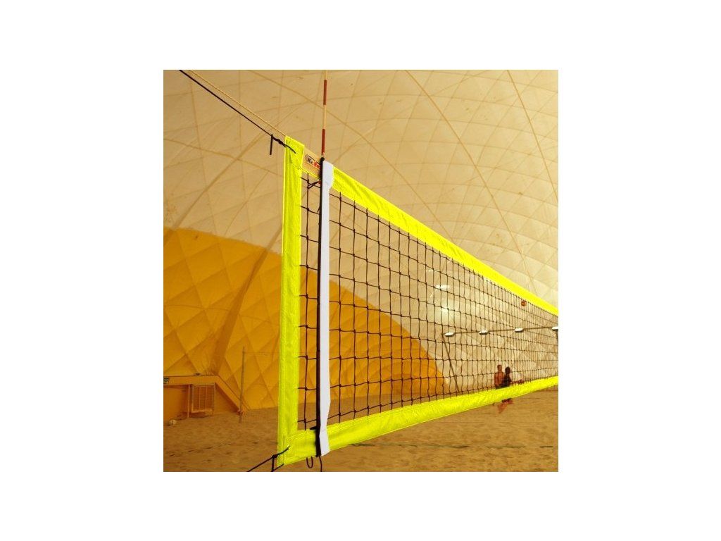 Sieť na plážový volejbal s 4 úväzkami Sieť na súťažný plážový volejbal je vyrobená podľa medzinárodných noriem. Beach volejbalová sieť je vyrobená z uzlovej sieťoviny z 3 mm polypropylénovej šnúry, s 10 cm okami. Horné a spodné okraje sú lemované pogumovanou látkou bielej, modrej, oranžovej alebo žltej farby, o šírke 8 cm. Na bokoch je čierna PES páska vystužená laminátovou tyčkou. V hornej páske je pretiahnuté kevlarové lanko V dĺžke 12,5 m. Na obidvoch stranách sieti sú 2 úväzky. Antenky a puzdro na antenky nie sú súčasťou siete. Rozmery siete: Šírka 8,5 m Výška 1 m Oko: 10 cm Materiál: 3 mm uzlová UV stabilizovaná polypropylénová sieť čiernej farby. Lemovanie siete: žltéDodatočné parametre