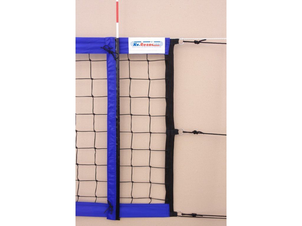 Sieť na plážový volejbal s 6 úväzkami Sieť na súťažný plážový volejbal je vyrobená podľa medzinárodných noriem. Sieť je vyrobená z uzlovej sieťoviny z 3 mm polypropylénovej šnúry, s 10 cm okami. Horné a spodné okraje sú lemované pogumovanou látkou bielej, modrej, oranžovej alebo žltej farbe, o šírke 8 cm. Na bokoch je čierna PES páska vystužená laminátovou tyčkou. V hornej páske je pretiahnuté kevlarové lanko dĺžke 12,5 m. Na obidvoch stranách siete sú 3 úväzky. Antenky a puzdro na antenky nie sú súčasťou siete. Rozmery siete: Šírka 8,5 m Výška 1 m Oko: 10 cm Materiál: 3 mm uzlová UV stabilizovaná polypropylénová sieť čiernej farby. Lemovanie siete: modréDodatočné parametre