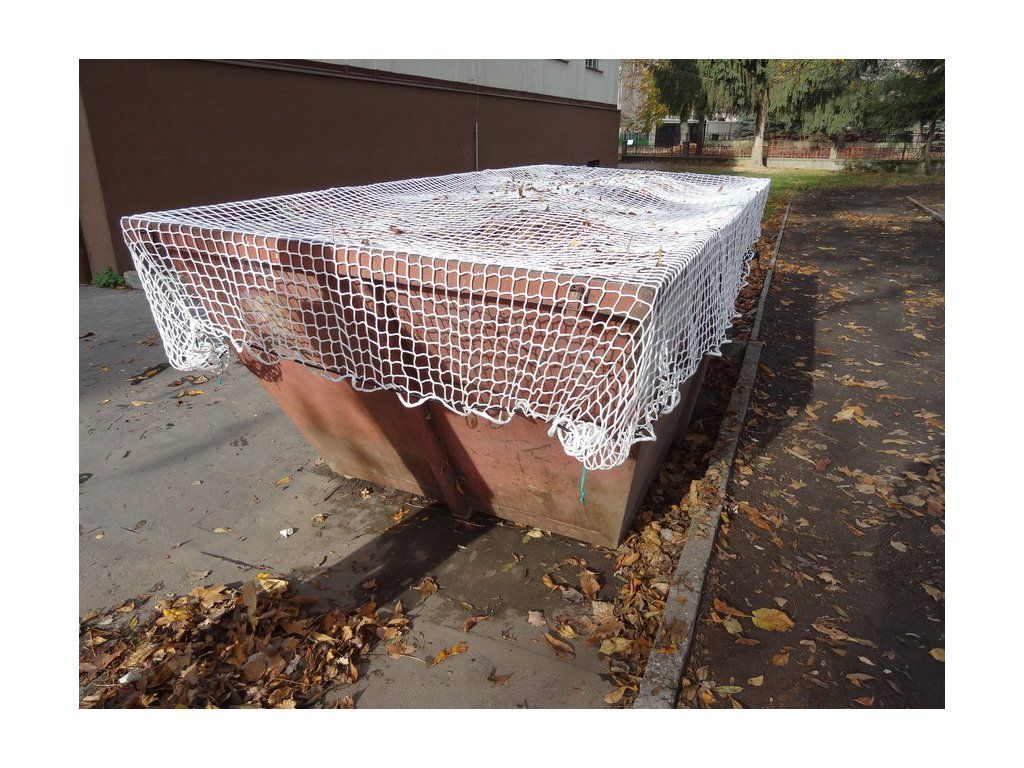 Bezuzlová sieť na kontajner Sieť slúži na zachytenie drobných a ľahkých predmetov počas prepravy v otvorených korbách, kontajneroch. Znižuje znečistenie prírody. Siete sú po obvode zavlečené gumovým lanom. Dĺžka gumového lana je cca 75% odvodu siete. Pružnosť gumového lana je 100%. Rozmery siete: 2,5 x 4,5 m Hrúbka siete: bezuzlová sieť 4 mm Veľkosť oka: 5 cm Priemer gumového lana: 8 mmDodatočné parametre