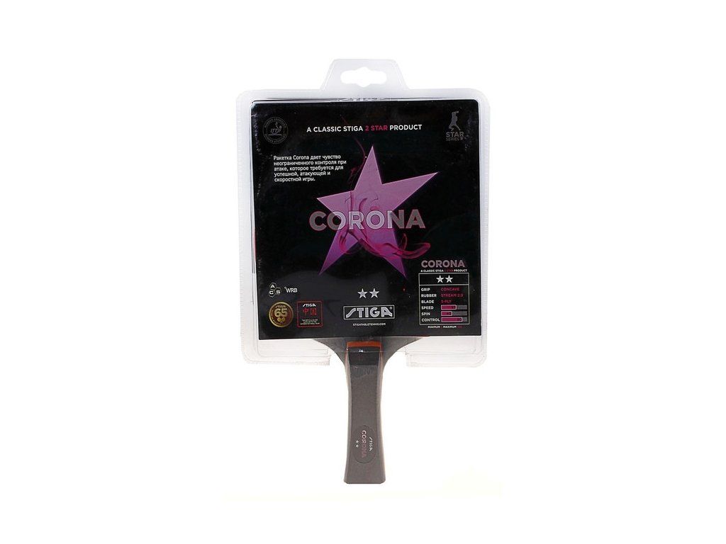 Stiga Corona stolnotenisová raketa, vlastnosti: 2 hviezdy, rýchlosť: 57, rotácia: 40, kontrola: 80, vrstva: 5, povrch: Stream 2,0Dodatočné parametre