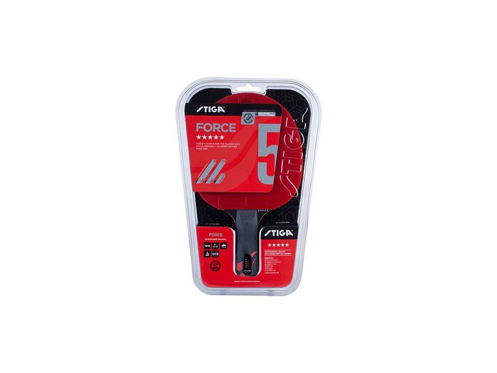 Špičková stolnotenisová raketa Stiga FORCE*****. Vhodná pre hráčov vyžadujúcich predovšetkým rýchlosť vedľa točivosti. Rýchlosť:99 Spin/falš:100+ Kontrola:37 Grip/držanie rúčky: konkávne Poťahy S5, 2,0 mm Vrstvy dreva: 7 FORCE 5 STAR 5-star Force is our ultimate bat in terms of spin in combination with speed. Force 5-star offers the player a 7-ply bat with unrivalled spin thanks to the ACS-technology. The WRB-technology gives the blade the perfect balanced weight to produce extreme amounts of speed. PRODUCT SPECS ART. NO. 1215-3017-01 CONTROL: 37 SPEED: 99 SPIN: 100+ VENEER: 7 STYLE: OFF+ GRIP: CONCAVEDodatočné parametre