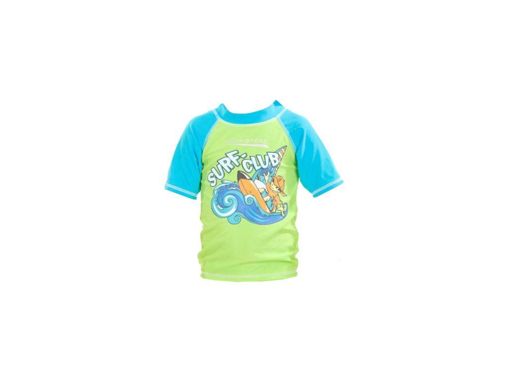 Detské tričko s krátkym rukávom Surf Club značky Aqua-speed, so zvýšeným krkom, potlačou surfistov a predovšetkým s UV ochranou. Je ideálne v kombinácii s čiapkou a kúpacími šortkami Surf Club. Detské tričko Aqua-Speed Surf Club poskytuje ochranu pred UV žiarením a umožní tak deťom nerušenú zábavu na slnku pri vode. POZOR: Tričko nie je prispôsobené priamo do vody, inak by mohlo dôjsť k poškodeniu potlače! materiál: 82% polyamid / 18% elastanVeľkostná tabuľka nižšie. : : : :Dodatočné parametre