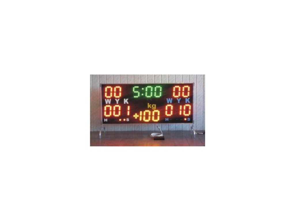 Digitálny čas do 9:59 Automatický klaksón po vypršaní času Zobrazenie váhy od 0 do 199 kg Tresty: 3x shido + hansoku LED diód: červená, zelená, žltá Výška číslic: 18 cm Rozmery: 130 x 50 x 5 cm Váha: 4 kg Napájanie: 230/12V 4A DCDodatočné parametre