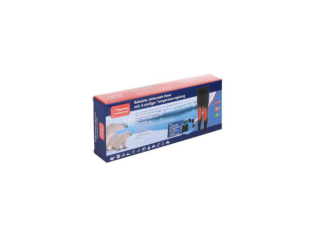 Zatiaľ najnovší počin úspešnej rakúskej firmy designed4inspiration produkujúce vyhrievané doplnky sú elektricky vyhrievané tričko Thermo Undershirt a elektricky vyhrievané nohavice Thermo Underpants. Thermo Underpants sú dlhé funkčné nohavice vybavené v oblasti kolenách flexibilnými vykurovacími telieskami z uhlíkových vlákien, ktorého spoločne s 2 vysoko výkonnými lítium-polymér batériami dokážu zahrievať Vaše nohy, podľa nastavenej teploty a teploty okolia, až 5 hodín. Ani potom však nemusíte trpieť zimou. Stačí vymeniť vybité batérie umiestnené v kapsičke na ľavom boku za batérie náhradné, ktoré môžete mať vďaka zanedbateľnej veľkosti a ešte menšej hmotnosti treba vo vrecku u bundy alebo vrchných nohavíc. Výmena je rýchla a jednoduchá. Pomocou predlžovacieho kábla si ale môžete do vrchných nohavíc alebo bundy umiestniť aj zapojené batérie a to predovšetkým preto, že súčasťou kapsičky s akumulátormi je aj tlačidlo s farebnou signalizáciou pre zapnutie / vypnutie a mechanickú reguláciu teploty v troch stupňoch (34°C, 39°C alebo 44°C). Okrem dlhých nohavíc s elektrickým vyhrievaním, 2 batérií a predlžovacieho kábla je súčasťou balenia aj adaptér 220V a nemôže chýbať ani český návod. Materiál nohavíc: 90% polyester, 10% elastan.Údržba: nepoužívajte v práčke, iba pre ručné umývanie. XS-SM-LXL-XXLMUŽI44-4648-5254-58ŽENY36-4042-4446-48 : : : : :Dodatočné parametre