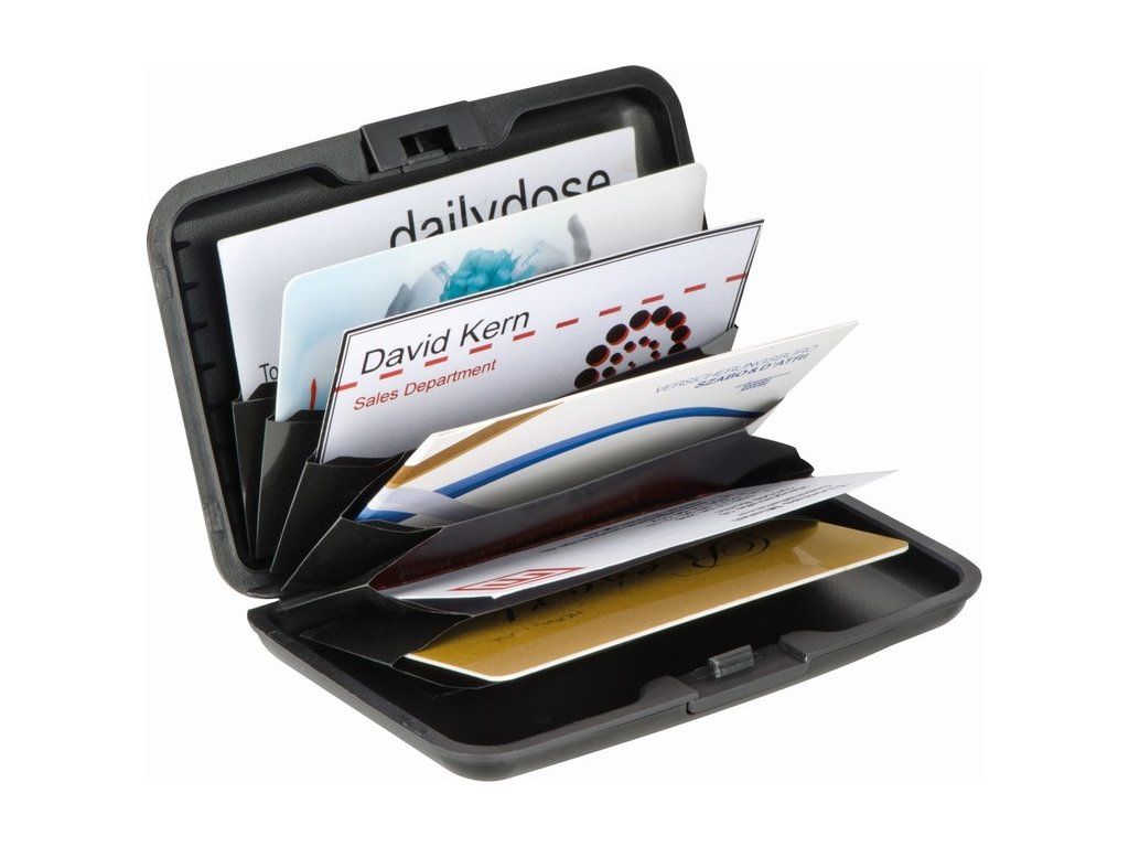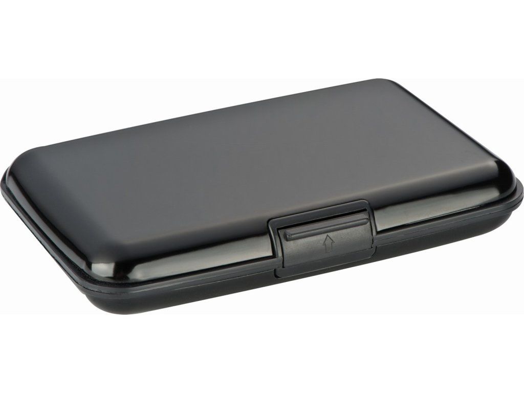 Pevný obal na karty, vizitky. Obal na kreditné karty obsahuje 6 vreciek pre 12 kreditných kariet. Hliník a ABS plast. Rozmer: 11 x 7,5 x 1,8cm Materiál: plast, hliník Farba: čierna, striebornáDodatočné parametre