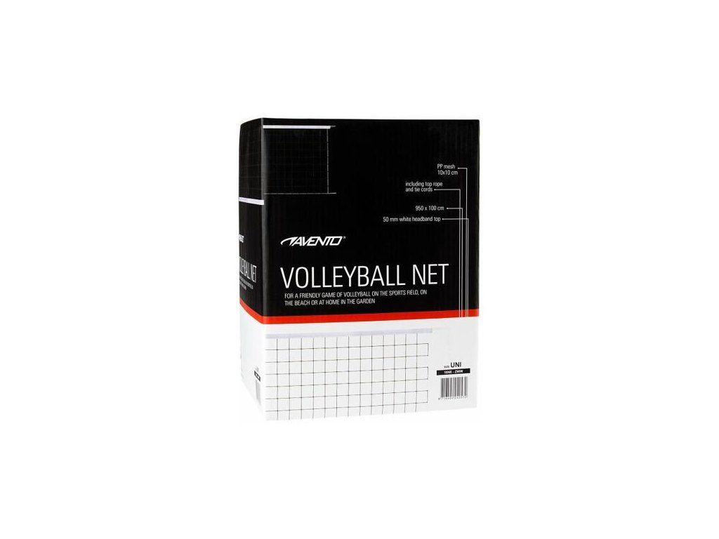 Volejbalová sieť Avento Volleyball Net je určená pre rekreačné použitie a na tréning. Sieť na volejbal so šnúrkou (2 zavesovací šnúry cca. 30 cm na oboch stranách) Avento je vyrobená zo 100% polypropylénu, jej rozmery sú 950 x 100 cm, rozmer ôk je 10 x 10 cm. Horná hrana siete je obšitá 5 centimetrov širokou páskou. Ak hľadáte cenovo dostupnú sieť pre hru s priateľmi či rodinou a na tréning, volejbalová sieť Avento je tou správnou voľbou. Rozmery balenia: 23 x 17 x 15 cm, hmotnosť 0,9 kg. : : :Dodatočné parametre