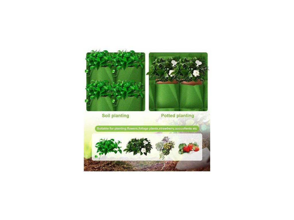 Vyrobte si doma či na záhrade krásnu stenu z kvetov pomocou textilného kvetináča na stenu Wall Grow Bag 25. Tento závesný kvetináč je vyrobený z textílie s gramážou 600 g/m2. Použitý materiál poskytuje rastlinám skvelé podmienky. Zaisťuje optimálnu cirkuláciu vzduchu a odvod prebytočnej vody. Po spojení viacerých kvetináčov si vytvoríte krásnu horizontálnu záhradku z rôznych kvetín, bylín a iných menších rastlín. Zavesíte ho jednoducho pomocou klincov či skrutiek (nie sú súčasťou balenia). Špecifikácie: - materiál: netkaná textília - gramáž: 600 g/m2 - rozmer: 100 x 100 cm - 25 vreciek (jedno vrecko 18 x 16 cm) - hmotnosť: 730 g - pre menšie kvety, bylinky - montážny materiál nie je súčasťou balenia : : :Dodatočné parametre